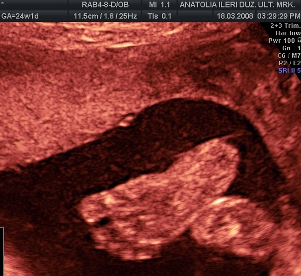 Normal şartlar altında yüz gebeliğin yaklaşık ikisinde (%2) bebekte anomali (sakatlık) vardır. Bu oran, tek yumurta ikizleri ve akraba evliliğinde iki katına (%4) çıkmakta olup, tüp bebek yöntemi ile hamile kalmış bebeklerde ise sakatlık görülme oranı %3'tür. Dolayısı ile yukarda belirtilen değerlendirmeyi takiben genellikle takip edilen sıraya göre baş ve yüz bölgesi, boyun bölgesi, kollar ve bacaklar, omurga kanalı, göğüs kafesi içindeki yapılar, karın içindeki yapılar ve genital bölge ayrıntılı olarak değerlendirilir. Değerlendirmede her bölge hem uzunlamasına hem de yatay kesitlerde taranır. Bu taramada her bölge kendi içinde detaylı değerlendirilerek sakatlık ve anormallik açısından taranır. Bu ultrasonografi ile amaç bebekte olası sakatlıkları tespit etmek ve bebekte var olabilecek olası kromozom anomalilerine (Örn: Down sendromu) yönelik belirteçleri tespit etmektir. Tespit olunan bu belirteçlerden sonra Down sendromlu bebek doğurabilme riskniz tekrar hesaplanır ve gerekirse Amniyosentez (su alma) uygulanabilir.